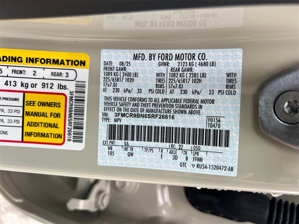 Equipment Group 200A, 4-Wheel Disc Brakes, 6 Speakers, ABS brakes, Air Conditioning, Alloy wheels, AM/FM radio: SiriusXM, AM/FM Stereo, Auto High-beam Headlights, Automatic temperature control, Brake assist, Cloth w/Easy-to-Clean Front Bucket Seats, Compass, Delay-off headlights, Driver door bin, Driver vanity mirror, Dual front impact airbags, Dual front side impact airbags, Electronic Stability Control, Emergency communication system: SYNC 4 911 Assist, Four wheel independent suspension, Front anti-roll bar, Front Bucket Seats, Front Center Armrest, Front License Plate Bracket, Front reading lights, Fully automatic headlights, Heated door mirrors, Illuminated entry, Knee airbag, Low tire pressure warning, Occupant sensing airbag, Outside temperature display, Overhead airbag, Overhead console, Panic alarm, Passenger door bin, Passenger vanity mirror, Power door mirrors, Power steering, Power windows, Radio data system, Rear anti-roll bar, Rear Parking Sensors, Rear reading lights, Rear seat center armrest, Rear window defroster, Rear window wiper, Remote keyless entry, Security system, SiriusXM, Speed control, Speed-sensing steering, Speed-Sensitive Wipers, Split folding rear seat, Steering wheel mounted audio controls, SYNC 4 w/Enhanced Voice Recognition, Tachometer, Telescoping steering wheel, Tilt steering wheel, Traction control, Trip computer, Variably intermittent wipers, and Wheels: 17 Carbonized Gray-Painted Aluminum.