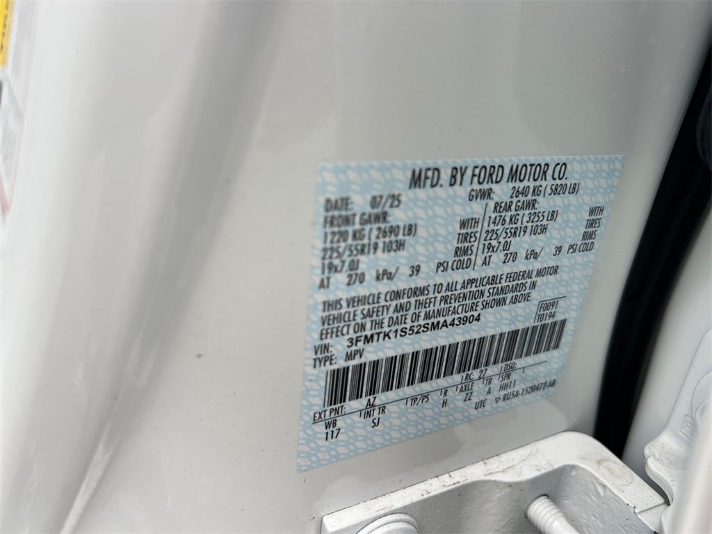 Equipment Group 100A Standard Package, Ford Connectivity Package (One-Time Purchase) (Cellular Connectivity for Audio/Video Streaming), Interior Protection Package (1st & 2nd Row Floor Liners w/o Carpet Mats, Cargo Area Cover, and Cargo Floor Liner), 4-Wheel Disc Brakes, 6 Speakers, ABS brakes, ActiveX Bucket Seats, Air Conditioning, Alloy wheels, AM/FM radio: SiriusXM with 360L, AM/FM Stereo, Apple CarPlay/Android Auto, Auto High-beam Headlights, Auto-dimming Rear-View mirror, Automatic temperature control, Brake assist, Bumpers: body-color, Compass, Delay-off headlights, Driver door bin, Driver vanity mirror, Dual front impact airbags, Dual front side impact airbags, Electronic Stability Control, Emergency communication system: 911 Assist, Exterior Parking Camera Rear, Four wheel independent suspension, Front anti-roll bar, Front Bucket Seats, Front Center Armrest, Front dual zone A/C, Front License Plate Bracket, Front reading lights, Fully automatic headlights, Garage door transmitter, Heated door mirrors, Illuminated entry, Internet access capable: FordPass Connect, Knee airbag, Low tire pressure warning, Mobile Power Cord (120V/240V), Navigation system: Connected Navigation, Occupant sensing airbag, Outside temperature display, Overhead airbag, Overhead console, Panic alarm, Passenger door bin, Passenger vanity mirror, Power door mirrors, Power driver seat, Power steering, Power windows, Radio data system, Rain sensing wipers, Rear anti-roll bar, Rear seat center armrest, Rear side impact airbag, Rear window defroster, Rear window wiper, Remote keyless entry, Security system, SiriusXM w/360L, Speed control, Speed-sensing steering, Speed-Sensitive Wipers, Split folding rear seat, Spoiler, Steering wheel mounted audio controls, SYNC 4A w/Enhanced Voice Recognition, Telescoping steering wheel, Tilt steering wheel, Traction control, Trip computer, Turn signal indicator mirrors, Variably intermittent wipers, and Wheels: 19 Machined-Face Aluminum.