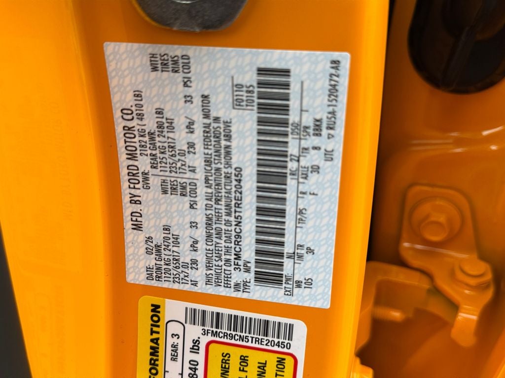 Class II Trailer Tow Package with Trailer Sway Control, Equipment Group 300A Standard Package (AM/FM Stereo, Front Driver/Passenger Seat Back Map Pockets, SiriusXM with 360L, SYNC 4 with Enhanced Voice Recognition, and Wheels: 18 Ebony Black), Ford Connectivity Package (1-Year Included), Internet access capable: 5G Modem - Ford Connectivity Package, Outer Banks Tech Package+ (Connected Navigation (1-Year Included) and Radio: HD w/B&O Sound System by Bang & Olufsen), Sasquatch Outer Banks Package (12.3 Cluster Display, 2 Rear D-Ring Recovery Hooks, 2nd Row Carpeted Seatback, 400W Pro Power Onboard, Auxiliary Switches and Wiring, Front and Rear Black Bumpers with Steel Plates, Front Brush Guard with Integrated Recovery Hooks, High Clearance Fender Flares, HOSS 2.0 Off-Road Suspension, Rubberized Flooring, Trail Control with Trail One-Pedal Drive, and Wheels: 17 Ebony Black-Painted Aluminum), 360-Degree Camera with Trail View, 4-Wheel Disc Brakes, 6 Speakers, ABS brakes, Air Conditioning, Alloy wheels, AM/FM radio: SiriusXM with 360L, Apple CarPlay/Android Auto, Auto High-beam Headlights, Auto-dimming Rear-View mirror, Automatic temperature control, Brake assist, Compass, Delay-off headlights, Driver door bin, Driver vanity mirror, Dual front impact airbags, Dual front side impact airbags, Electronic Stability Control, Emergency communication system: SYNC 4 911 Assist, Exterior Parking Camera Rear, Four wheel independent suspension, Front and Rear Floor Liners Without Carpet Mats, Front anti-roll bar, Front Bucket Seats, Front Center Armrest, Front dual zone A/C, Front fog lights, Front License Plate Bracket, Front Parking Sensors, Front reading lights, Fully automatic headlights, Heated door mirrors, Heated front seats, Heated steering wheel, Illuminated entry, Knee airbag, Low tire pressure warning, Memory seat, Occupant sensing airbag, Outside temperature display, Overhead airbag, Overhead console, Panic alarm, Passenger door bin, Passenger vanity mirror, Power door mirrors, Power driver seat, Power Moonroof, Power passenger seat, Power steering, Power windows, Radio data system, Rear anti-roll bar, Rear Parking Sensors, Rear reading lights, Rear seat center armrest, Rear window defroster, Rear window wiper, Remote keyless entry, Reverse Brake Assist, Security system, Speed control, Speed-sensing steering, Speed-Sensitive Wipers, Split folding rear seat, Steering wheel mounted audio controls, Tachometer, Telescoping steering wheel, Tilt steering wheel, Traction control, Trip computer, and Variably intermittent wipers.