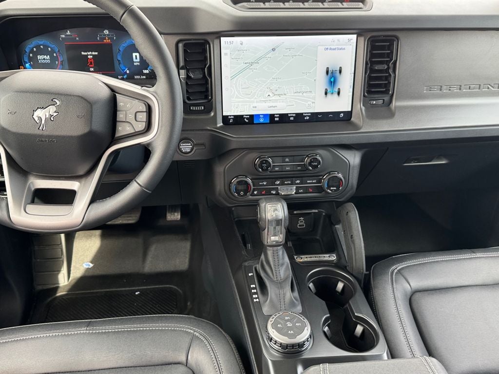 Equipment Group 332A Mid Package (2-Door Intelligent Access with Lock/Unlock, AM/FM Stereo, Ambient Footwell Lighting, Connected Navigation, Driver and Front Passenger Illuminated Sliding Visor Vanity Mirrors, Dual Smart Charging USB Ports, Dual-Zone Electronic Automatic Temperature Control, Front Row Heated Seats, Heated Steering Wheel, Marine Grade Vinyl Heated Bucket Seats, Pro Power Onboard - 400W, Rear Parking Sensors, SiriusXM with 360L, SYNC 4, and Wheels: 17 Carbonized Gray-Painted Aluminum), Ford Connectivity Package (1-Year Included), Sasquatch Package (Front Stabilizer Disconnect, High Clearance Suspension, Position-Sensitive Bilstein Shock Absorbers, and Wheels: 17 Matte Black Alloy), 4-Wheel Disc Brakes, 7 Speakers, ABS brakes, Air Conditioning, Alloy wheels, AM/FM radio: SiriusXM with 360L, Auto High-Beam Headlamps, Auto High-beam Headlights, Auto-dimming Rear-View mirror, BLIS Blind Spot Information System, Brake assist, Compass, Delay-off headlights, Driver door bin, Driver vanity mirror, Dual front impact airbags, Dual front side impact airbags, Electronic Stability Control, Emergency communication system: 911 Assist, Exterior Parking Camera Rear, Front anti-roll bar, Front Bucket Seats, Front Center Armrest, Front fog lights, Front License Plate Bracket, Front reading lights, Front Row Top Panels and Door Storage Bags, Front wheel independent suspension, Fully automatic headlights, Hard Top Sound Deadening Headliner, Heated door mirrors, Heated front seats, Illuminated entry, Integrated roll-over protection, Lane-Keeping System, Leather Shift Knob, Low tire pressure warning, Occupant sensing airbag, Outside temperature display, Overhead airbag, Overhead console, Painted Hard Top, Panic alarm, Passenger door bin, Passenger vanity mirror, Power door mirrors, Power steering, Power windows, Pre-Collision Assist with Automatic Emergency Braking, Radio data system, Rear-View Camera, Rear-Window Defroster and Washer, Remote keyless entry, Remote Start System, Security system, Speed control, Split folding rear seat, Steering wheel mounted audio controls, Tachometer, Telescoping steering wheel, Tilt steering wheel, Traction control, Trip computer, Variably intermittent wipers, and Voltmeter. Price includes: $750 - Retail Customer Cash. Exp. 03/31/2026