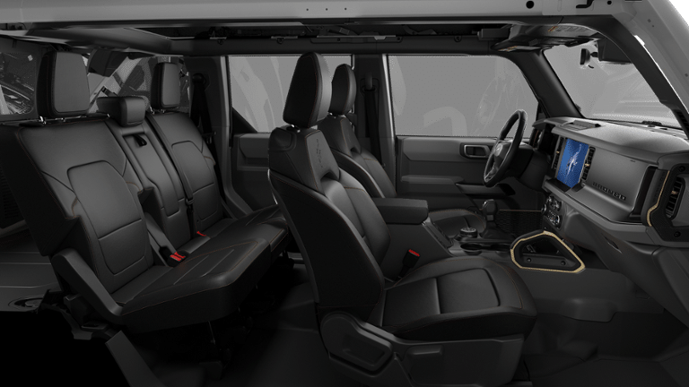 Ford Connectivity Package (1-Year Included), 2-Door Intelligent Access with Lock/Unlock, 4-Wheel Disc Brakes, 4.7 Axle Ratio, 7 Speakers, ABS brakes, Air Conditioning, Alloy wheels, AM/FM radio: SiriusXM with 360L, AM/FM Stereo, Ambient Footwell Lighting, Auto High-Beam Headlamps, Auto High-beam Headlights, Auto-dimming Rear-View mirror, BLIS Blind Spot Information System, Brake assist, Compass, Connected Navigation, Delay-off headlights, Driver and Front Passenger Illuminated Sliding Visor Vanity Mirrors, Driver door bin, Driver vanity mirror, Dual front impact airbags, Dual front side impact airbags, Dual Smart Charging USB Ports, Dual-Zone Electronic Automatic Temperature Control, Electronic Stability Control, Emergency communication system: 911 Assist, Exterior Parking Camera Rear, Front anti-roll bar, Front Bucket Seats, Front Center Armrest, Front fog lights, Front License Plate Bracket, Front reading lights, Front Row Heated Seats, Front Row Top Panels and Door Storage Bags, Front Stabilizer Disconnect, Front wheel independent suspension, Fully automatic headlights, Hard Top Sound Deadening Headliner, Heated door mirrors, Heated front seats, Heated Steering Wheel, High Clearance Suspension, Illuminated entry, Integrated roll-over protection, Lane-Keeping System, Leather Shift Knob, Low tire pressure warning, Marine Grade Vinyl Heated Bucket Seats, Occupant sensing airbag, Outside temperature display, Overhead airbag, Overhead console, Painted Hard Top, Panic alarm, Passenger door bin, Passenger vanity mirror, Position-Sensitive Bilstein Shock Absorbers, Power door mirrors, Power steering, Power windows, Pre-Collision Assist with Automatic Emergency Braking, Pro Power Onboard - 400W, Radio data system, Rear Parking Sensors, Rear-View Camera, Rear-Window Defroster and Washer, Remote keyless entry, Remote Start System, Security system, SiriusXM with 360L, Speed control, Split folding rear seat, Steering wheel mounted audio controls, SYNC 4, Tachometer, Telescoping steering wheel, Tilt steering wheel, Traction control, Trip computer, Variably intermittent wipers, Voltmeter, and Wheels: 17 Carbonized Gray-Painted Aluminum.