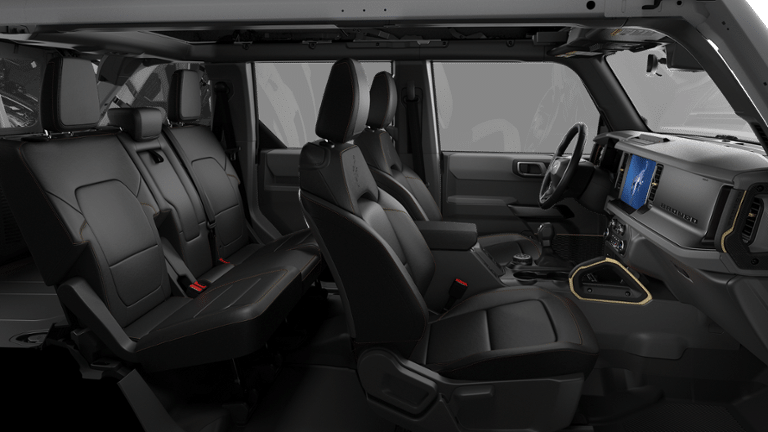 Equipment Group 334A Lux Package (2-Door Intelligent Access with Lock/Unlock, 360-Degree Camera, Adaptive Cruise Control, Ambient Footwell Lighting, Connected Navigation, Driver and Front Passenger Illuminated Sliding Visor Vanity Mirrors, Dual Smart Charging USB Ports, Dual-Zone Electronic Automatic Temperature Control, Evasive Steering Assist, Front Parking Sensors, Front Row Heated Seats, Heated Steering Wheel, Information on Demand Panel, Marine Grade Vinyl Heated Bucket Seats, Pro Power Onboard - 400W, Rear Parking Sensors, Sideview Mirrors, and Wheels: 17 Carbonized Gray-Painted Aluminum), Ford Connectivity Package (1-Year Included), 4-Wheel Disc Brakes, 4.7 Axle Ratio, 7 Speakers, ABS brakes, Air Conditioning, Alloy wheels, AM/FM radio: SiriusXM with 360L, AM/FM Stereo, Auto High-Beam Headlamps, Auto High-beam Headlights, Auto-dimming Rear-View mirror, BLIS Blind Spot Information System, Brake assist, Carbonized Gray Molded-in-Color Hard Top, Compass, Delay-off headlights, Driver door bin, Driver vanity mirror, Dual front impact airbags, Dual front side impact airbags, Electronic Stability Control, Emergency communication system: 911 Assist, Exterior Parking Camera Rear, Front and Rear Floor Liners Without Carpet Floor Mats, Front anti-roll bar, Front Bucket Seats, Front Center Armrest, Front fog lights, Front License Plate Bracket, Front reading lights, Front wheel independent suspension, Fully automatic headlights, Hard Top Sound Deadening Headliner, Heated door mirrors, Heated front seats, Illuminated entry, Integrated roll-over protection, Lane-Keeping System, Leather Shift Knob, Low tire pressure warning, Occupant sensing airbag, Outside temperature display, Overhead airbag, Overhead console, Panic alarm, Passenger door bin, Passenger vanity mirror, Power door mirrors, Power steering, Power windows, Pre-Collision Assist with Automatic Emergency Braking, Radio data system, Rear-View Camera, Rear-Window Defroster and Washer, Remote keyless entry, Security system, SiriusXM with 360L, Speed control, Split folding rear seat, Steering wheel mounted audio controls, SYNC 4, Tachometer, Telescoping steering wheel, Tilt steering wheel, Traction control, Trip computer, Variably intermittent wipers, and Voltmeter.