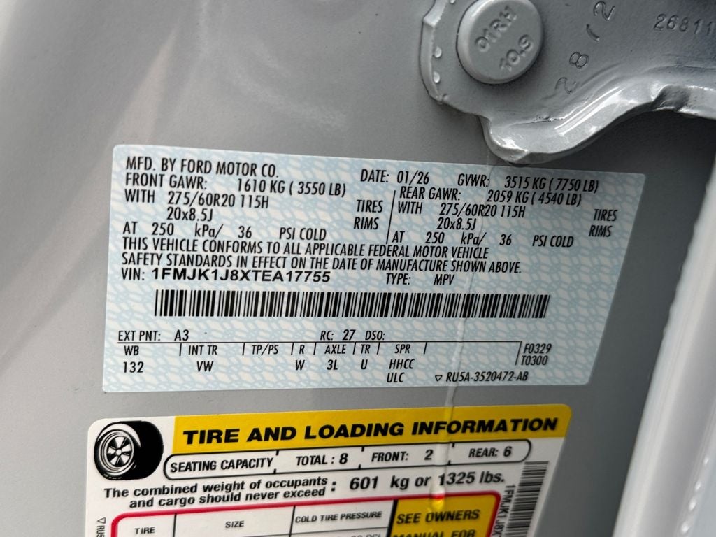 Equipment Group 202A Touring Package (26mm Engine Radiator, 2nd Row Power-Folding Captain's Chairs, 3.73 Axle Ratio, 360-Degree Zone Lighting, 3rd Row Vinyl Seats, 4-Door Intelligent Access (Lock/Unlock), 4-Way Manual Head Restraints, Active Air Dam, ActiveX-Trimmed Front Heated Captain's Chairs, Dual Power-Folding Sideview Mirrors with Autofold, Flex Powered Console, Ford Digital Experience, Ford Split Gate, Front Side Laminated Glass, Heated Steering Wheel, Heavy-Duty Trailer Tow, Integrated Trailer Brake Control, Memory Driver Seat, Power Tilt/Telescopic Steering Wheel with Memory, Pro Power Onboard - 400W, Radio: AM/FM Stereo with MP3 Capable, Rain Sensitive Windshield Wipers, SiriusXM with 360L, USB Ports, and Wheels: 18 x 8.5 Dark Alloy Painted Aluminum), Ford Connectivity Package (1-Time Purchase), Ford Connectivity Package (1-Year Included), 2nd Row Pwr-Folding 40/20/40 ActiveX-Trimmed Bench Seat, 3rd Row Flexible Seating (40/20/40), 3rd row seats: split-bench, 4-Wheel Disc Brakes, 6 Speakers, ABS brakes, Air Conditioning, Alloy wheels, AM/FM radio: SiriusXM with 360L, Apple CarPlay/Android Auto, Auto High-beam Headlights, Auto-dimming Rear-View mirror, Automatic temperature control, BlueCruise (equipment + 1-Year + 90-Day Plan), Brake assist, Bumpers: body-color, Cloth Front Captain's Chairs, Compass, Delay-off headlights, Driver door bin, Driver vanity mirror, Dual front impact airbags, Dual front side impact airbags, Electronic Stability Control, Emergency communication system: 911 Assist, Exterior Parking Camera Rear, Four wheel independent suspension, Front anti-roll bar, Front Bucket Seats, Front Center Armrest, Front dual zone A/C, Front License Plate Bracket, Front reading lights, Fully automatic headlights, Heated door mirrors, Illuminated entry, Intersection Assist, Low tire pressure warning, Navigation System, Occupant sensing airbag, Outside temperature display, Overhead airbag, Overhead console, Panic alarm, Passenger door bin, Passenger vanity mirror, Power door mirrors, Power driver seat, Power Panoramic Vista Roof with Power Sunshade, Power passenger seat, Power steering, Power windows, Radio data system, Rear air conditioning, Rear anti-roll bar, Rear reading lights, Rear window defroster, Rear window wiper, Reclining 3rd row seat, Remote keyless entry, Security system, Speed control, Speed-sensing steering, Speed-Sensitive Wipers, Split folding rear seat, Spoiler, Steering wheel mounted audio controls, Tachometer, Telescoping steering wheel, Tilt steering wheel, Traction control, Trip computer, Variably intermittent wipers, Voltmeter, and Wheels: 20 x 8.5 Bright Machined Aluminum.