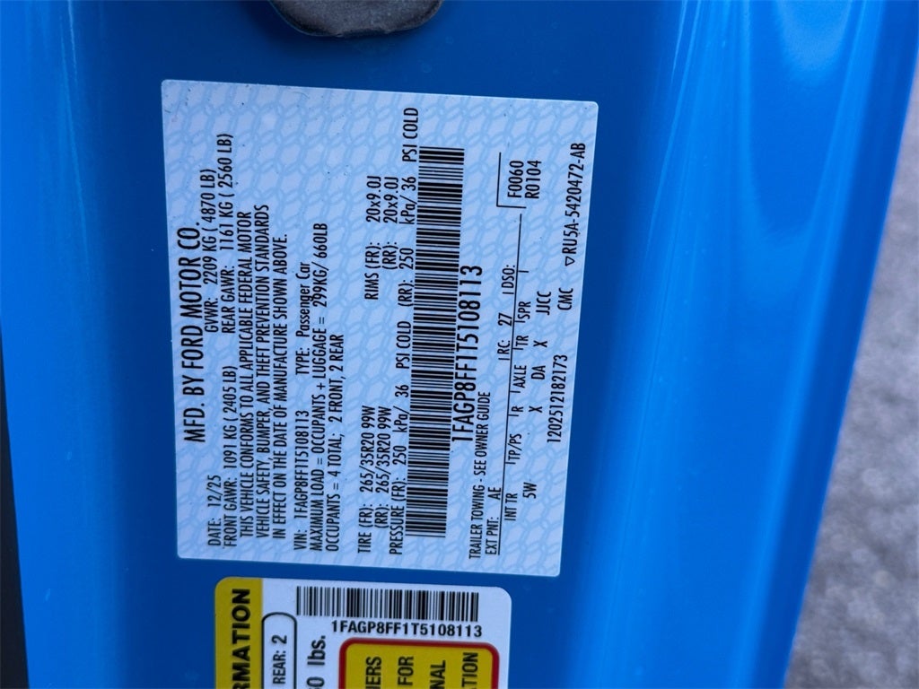 Anti-Theft Package (Active Anti-Theft System, Locking Center Console, and Wheel Locking Kit), Equipment Group 401A High Package (Aluminum Foot Pedals, AM/FM Stereo, Driver Seat Memory with 3 Settings, HD Radio, Leather-Trimmed Bucket Seats with Color Accents, Magnesium Framed Panoramic Curved Display, Perimeter Alarm, SiriusXM with 360L, SYNC 4, and Wheels: 19 x 8.5 Shadow Silver-Painted Aluminum), Ford Co-Pilot360 Assist+ (One-Year Connected Navigation and Pre-Collision Assist with Automatic Emergency Braking), Ford Connectivity Package (one-Time Purchase - 7 Years), 1st Row Carpeted Black Floor Mats, 3.55 Limited Slip Rear Axle, 4-Wheel Disc Brakes, 9 Speakers, ABS brakes, Active Valve Performance Exhaust, ActiveX Trimmed Bucket Seats, Adaptive Cruise Control, Air Conditioning, Alloy wheels, AM/FM radio: SiriusXM with 360L, Auto High-beam Headlights, Auto-dimming Rear-View mirror, Automatic temperature control, Brake assist, Bumpers: body-color, Climate Controlled Heated/Cooled Front Seats, Compass, Convertible roof lining, Delay-off headlights, Driver door bin, Driver vanity mirror, Dual front impact airbags, Dual front side impact airbags, Electronic Stability Control, Emergency communication system: 911 Assist, Exterior Parking Camera Rear, Four wheel independent suspension, Front anti-roll bar, Front Bucket Seats, Front Center Armrest, Front dual zone A/C, Front reading lights, Fully automatic headlights, Glass rear window, Heated front seats, Heated steering wheel, Illuminated entry, Instrument Panel with Accent Stitch, Knee airbag, Lane-Keeping System with Lane Keeping Aid, Leather Shift Knob, Leather steering wheel, Low tire pressure warning, Occupant sensing airbag, Outside temperature display, Overhead console, Panic alarm, Passenger door bin, Passenger vanity mirror, Power convertible roof, Power door mirrors, Power driver seat, Power passenger seat, Power steering, Power windows, Premium Floor Liners Front and Rear (with Carpet Mats), Radio data system, Rain sensing wipers, Rear anti-roll bar, Rear Parking Sensors, Rear window defroster, Remote keyless entry, Security system, Speed control, Speed-sensing steering, Speed-Sensitive Wipers, Sport steering wheel, Steering wheel mounted audio controls, Tachometer, Telescoping steering wheel, Tilt steering wheel, Traction control, Trip computer, Variably intermittent wipers, Ventilated front seats, Voltmeter, and Wheels: 20 x 9 Premium-Painted Aluminum. Price includes: $1000 - Retail Customer Cash. Exp. 03/31/2026